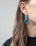 Aros dorados con base de piedra celeste, libre de níquel y plomo, y ágata petróleo, con racimo de cristales y piedras naturales en tonos, celestes, petróleo y turquesa.