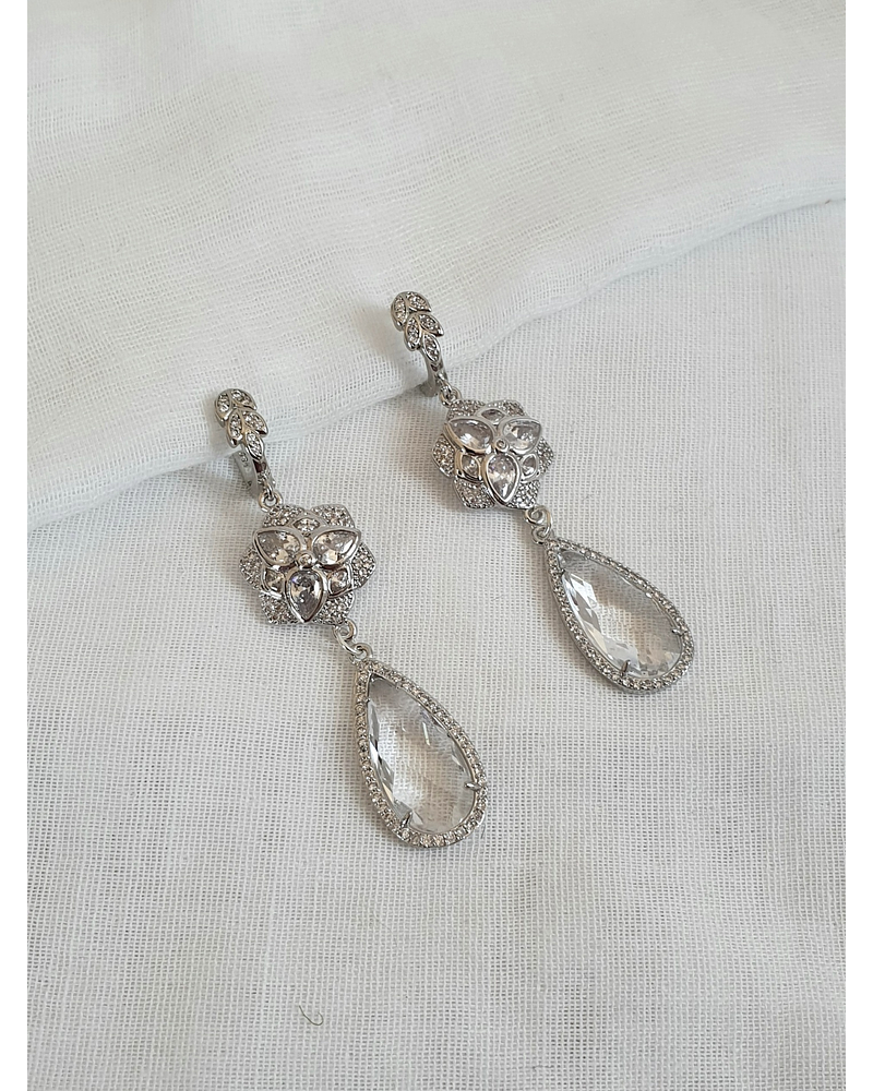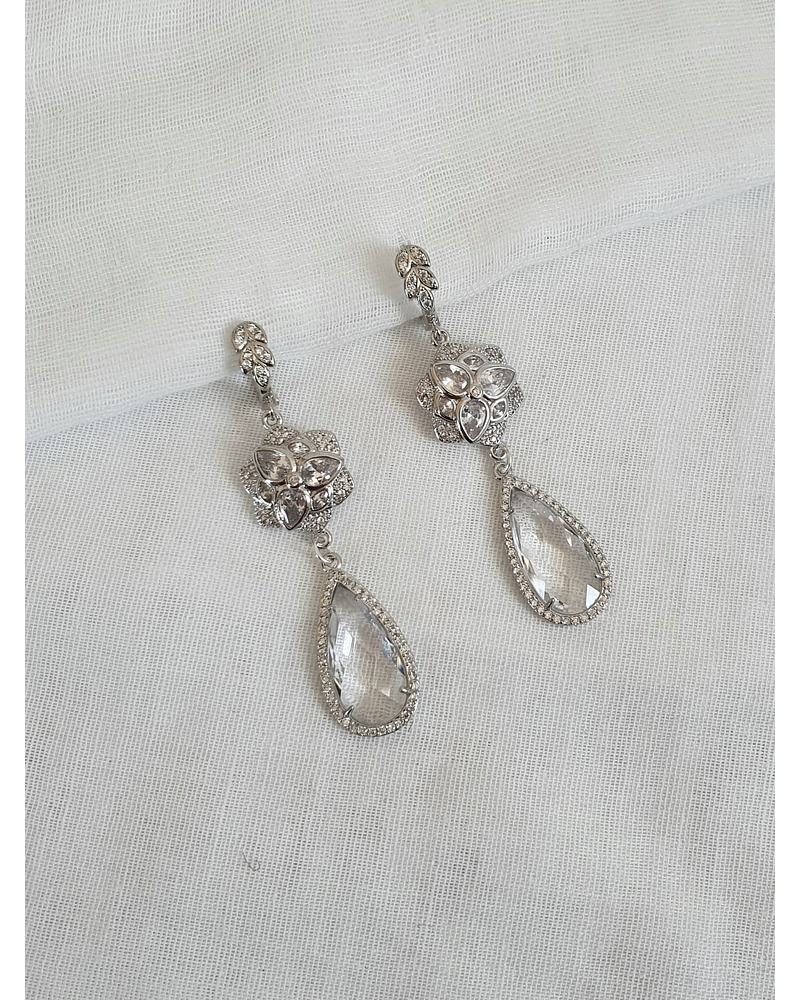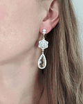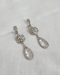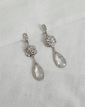 Aros con argolla de hojita de circonita de plata con flor de cristales y cristal de forma de lagrima transparente con circonitas en el borde