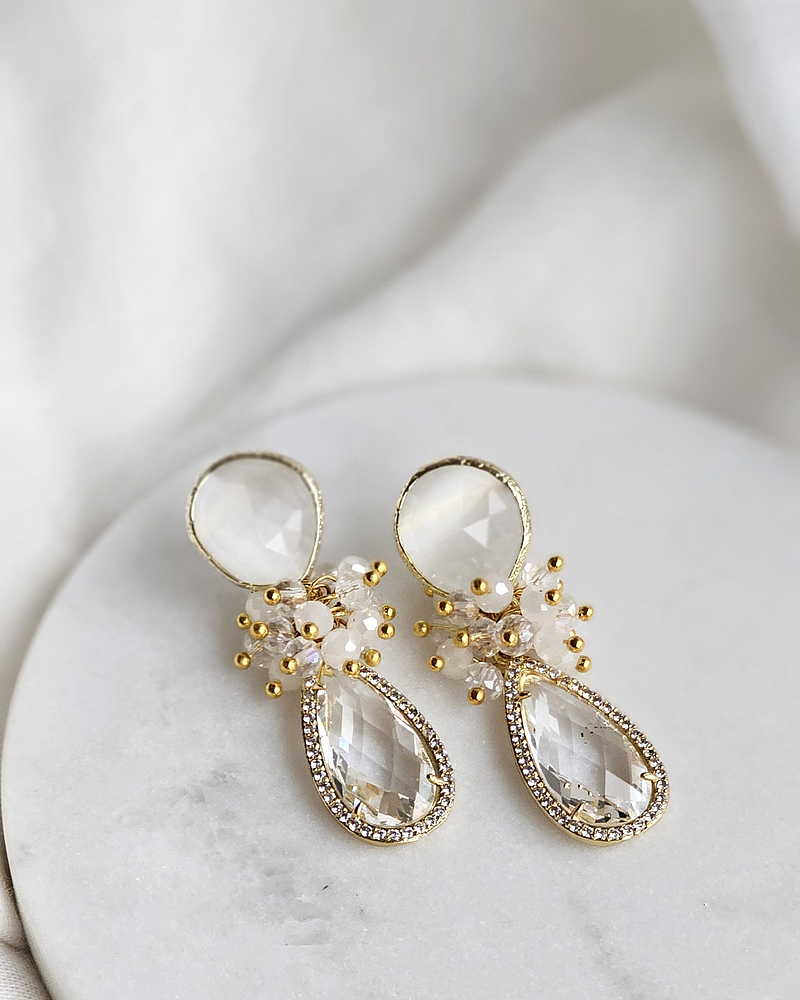 Aros dorados con base con piedra de ojo de gato blanco enchapado en oro, libre de níquel y plomo, con cristal alargado transparente rodeado de circonitas y racimo de cristales.