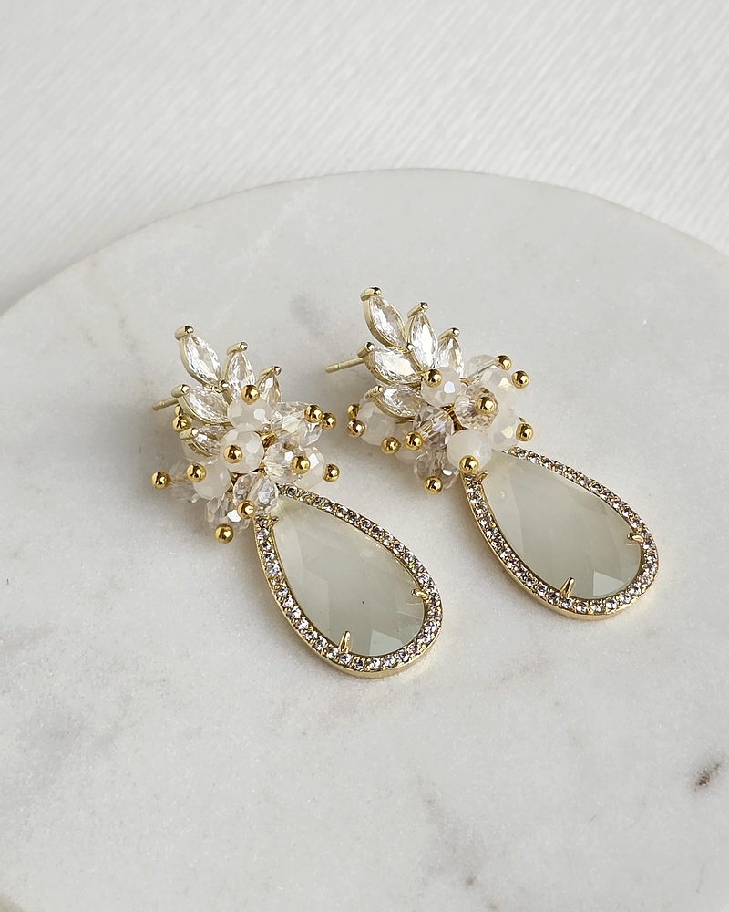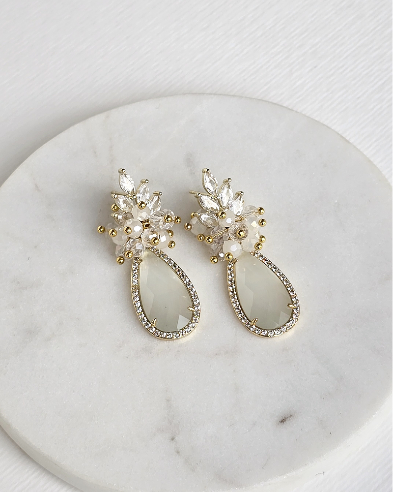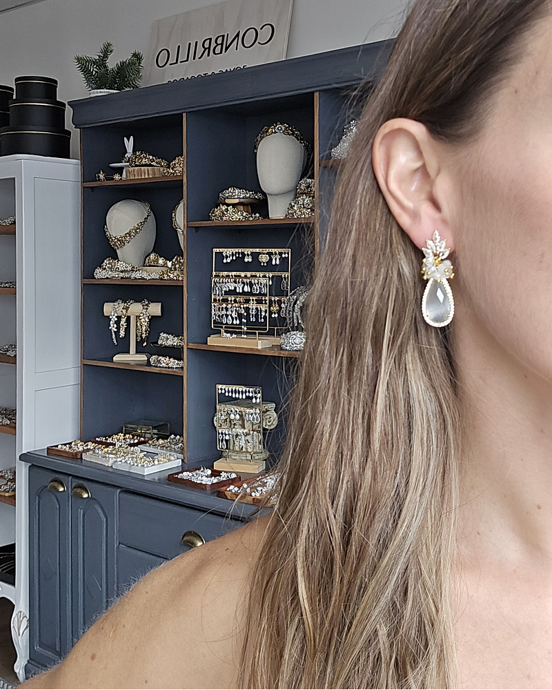 Aros dorados con circonita, cristal blanco rodeado de circonitas y racimo de cristales en tonos blancos y transparentes.