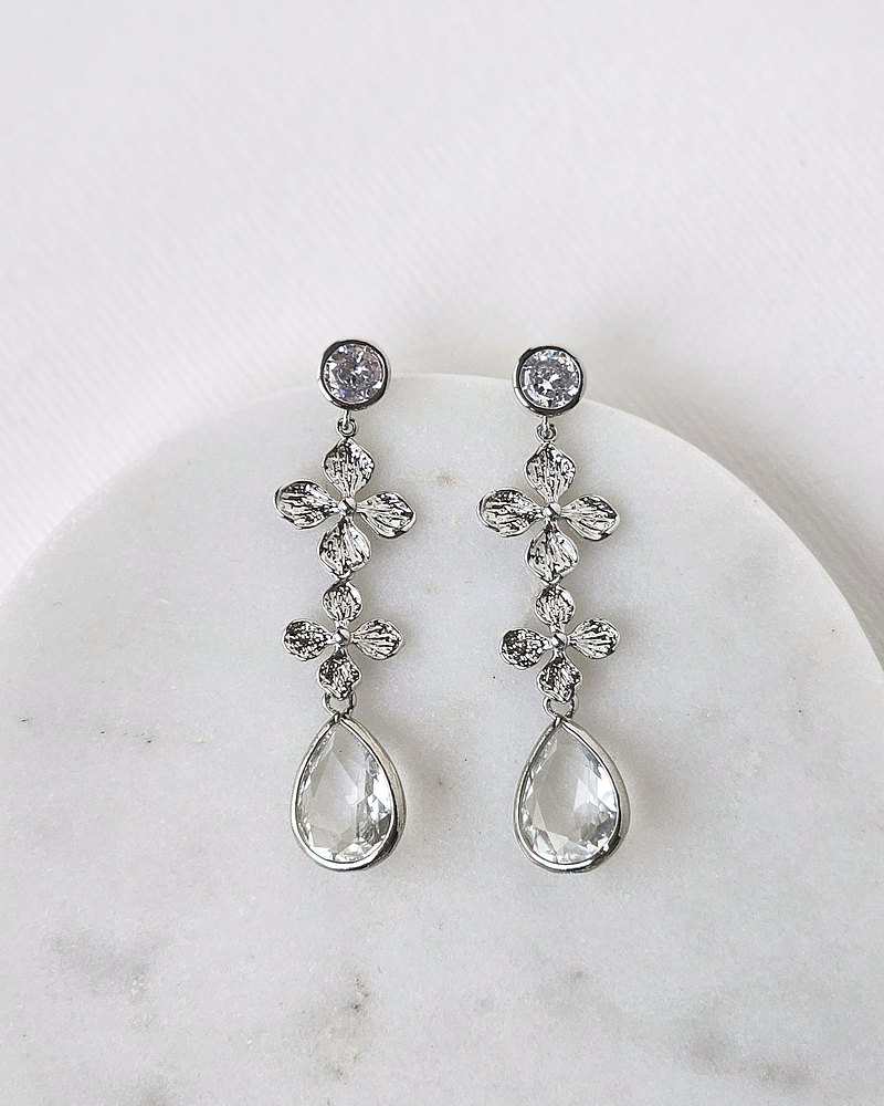 Aros dorados de circonita enchapado en rodio sin níquel, doble flor y cristal facetado.