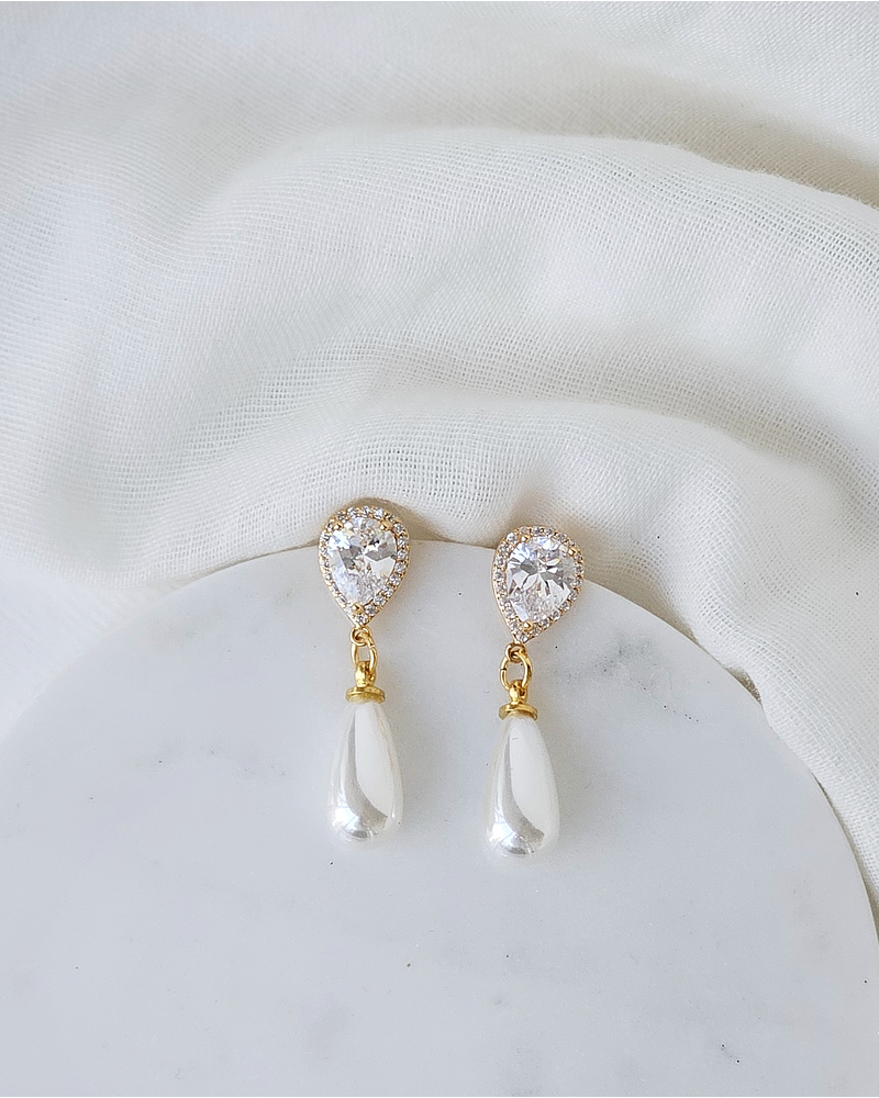 Aros dorados clásicos con base de circón grande rodeado de circonitas, enchapado en oro sin níquel y perla alargada de fantasía.