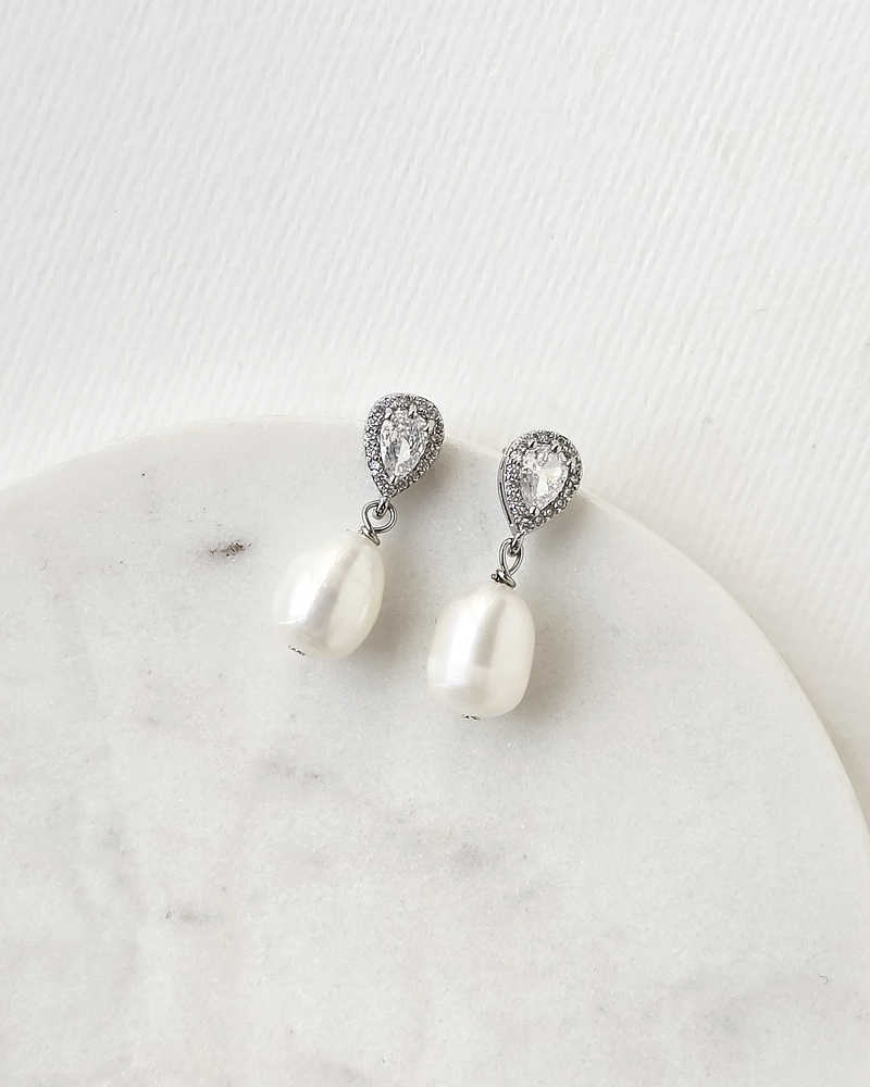Aros plateados clásicos con base de circón grande rodeado de circonitas más chicas, enchapado en oro blanco, hipoalergénico, y perla natural de río.