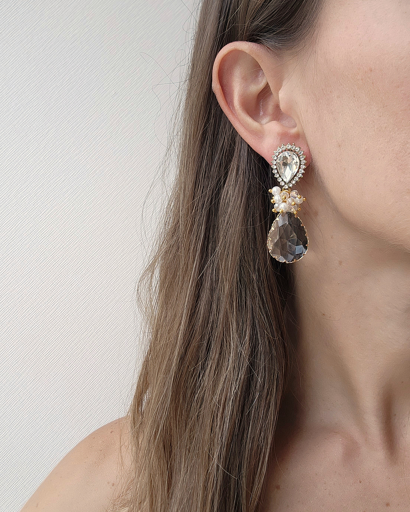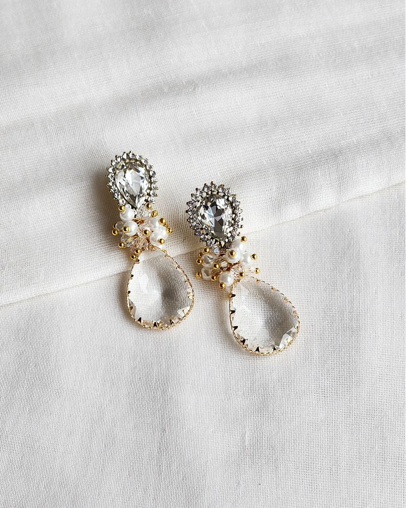 Aros dorados con base brillante y cristal transparente facetado, con racimo de cristales y perlas de fantasía.