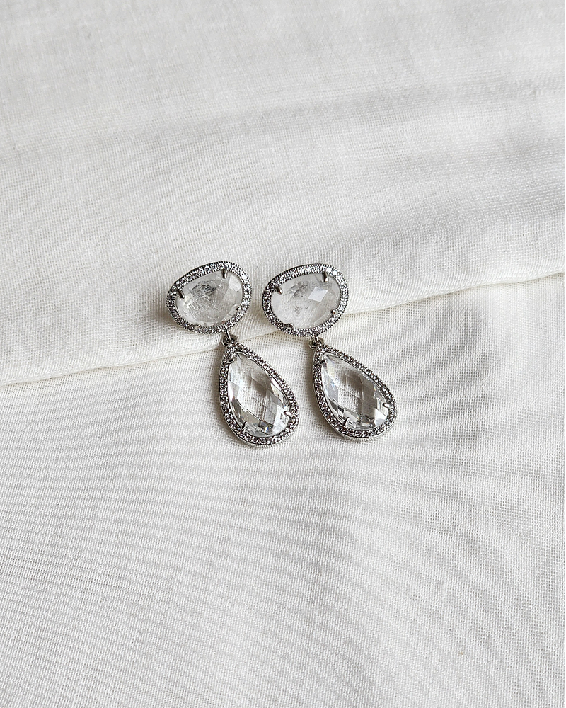 Aros plateados enchapado en rodio con cuarzo y cristal transparente, ambos rodeados de circonitas.