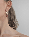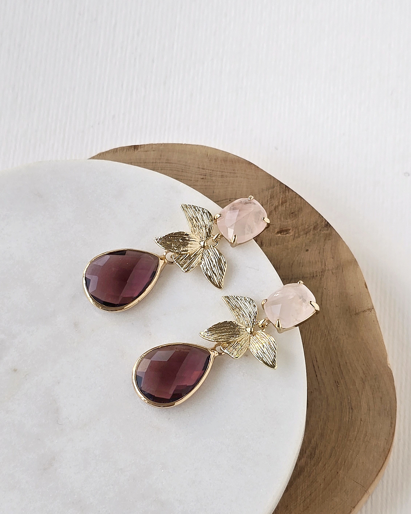Aros dorados de piedra cuarzo rosado, enchapado en oro, hoja y cristal facetado color burdeo.