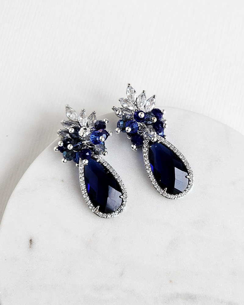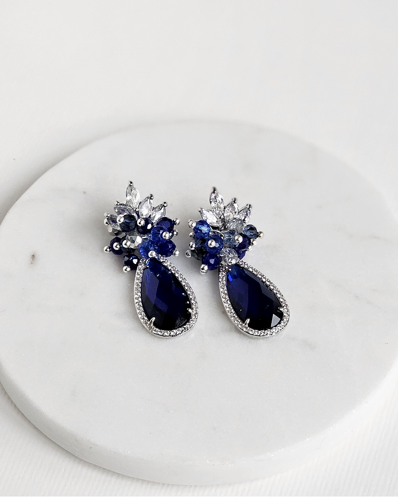 Aros plateados con base de circonita enchapado en rodio sin níquel, con cristal azul rodeado de circonitas.