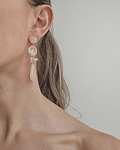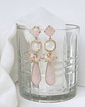 Aros dorados largos con base de cuarzo rosa enchapado en oro libre de níquel, cuarzo blanco rodeado de circonitas y cuarzo rosa alargado con racimo de cristales y piedras.