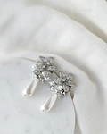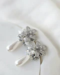 Aros plateados de fantasía de flor con micro circonitas, perla de fantasía alargada y racimo.