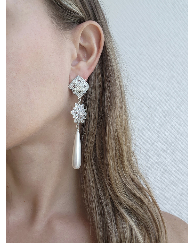 Aros plateados con base de rombo vintage, flor de circonita y perla larga de fantasía