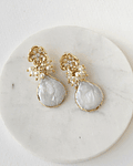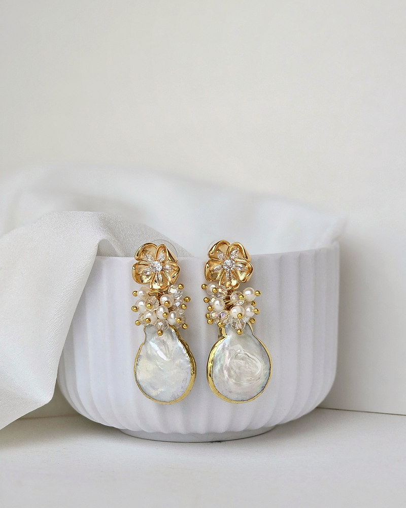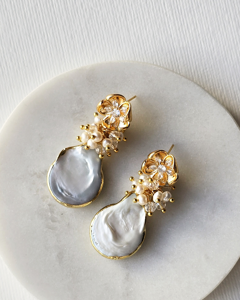 Aros dorados de flor con circones enchapado en oro, libre de níquel, con perla natural barroca de agua dulce y racimo de cristales y perlas naturales.