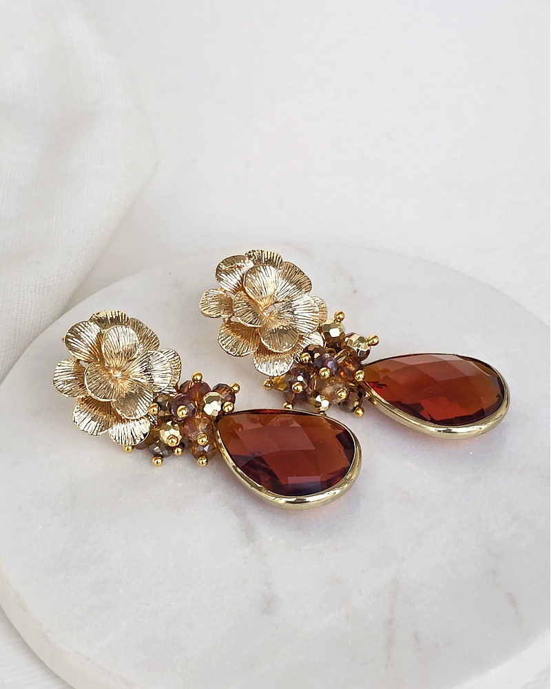 Aros dorados con base de flor enchapado en oro sin níquel, con cristal café caramelo y racimo de cristales.