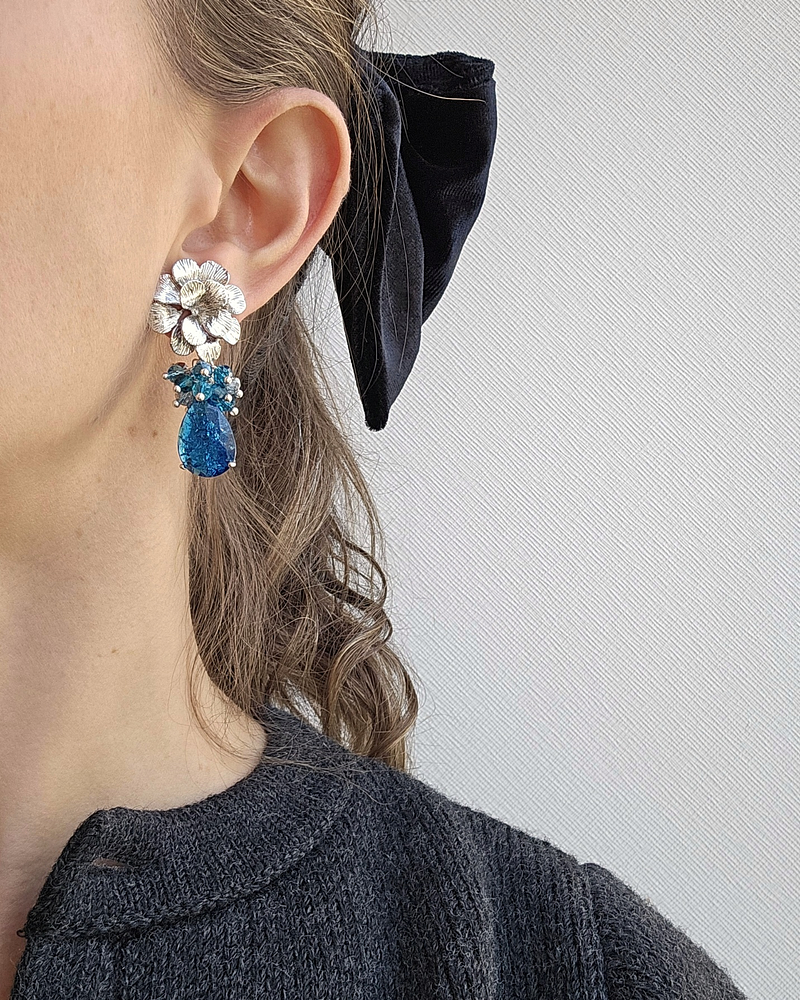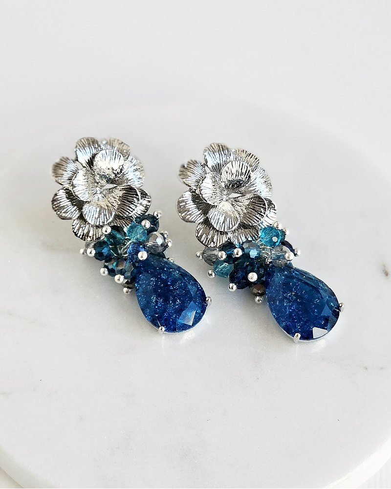Aros plateados de flor grande enchapada en rodio sin níquel, cristal petróleo y racimo de cristales.