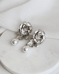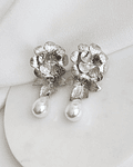 Aros plateados de flor enchapado en rodio con hoja y perla de fantasía.