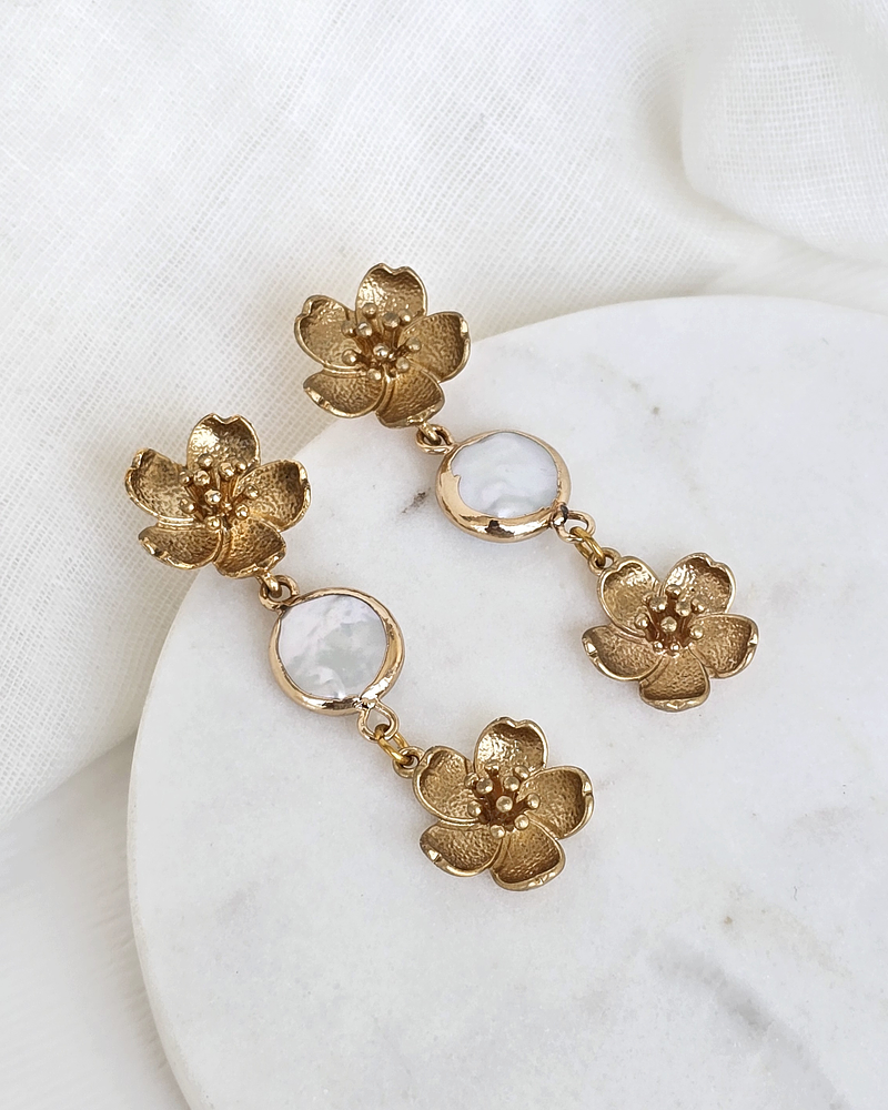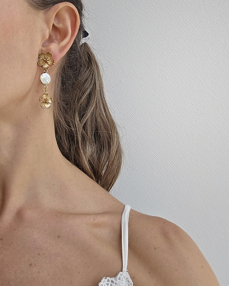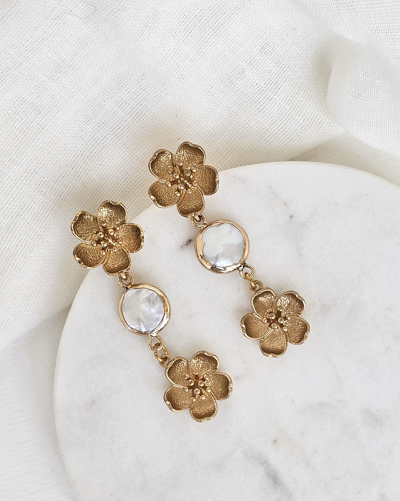 Aros dorados con base de flor enchapada en oro libre de níquel, perla y flor, ambas flores son envejecidas.