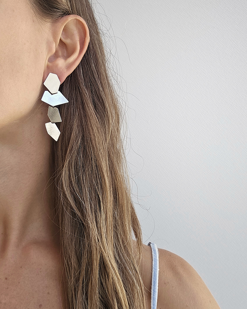 Aros plateados geométricos largos enchapados en rodio sin níquel.