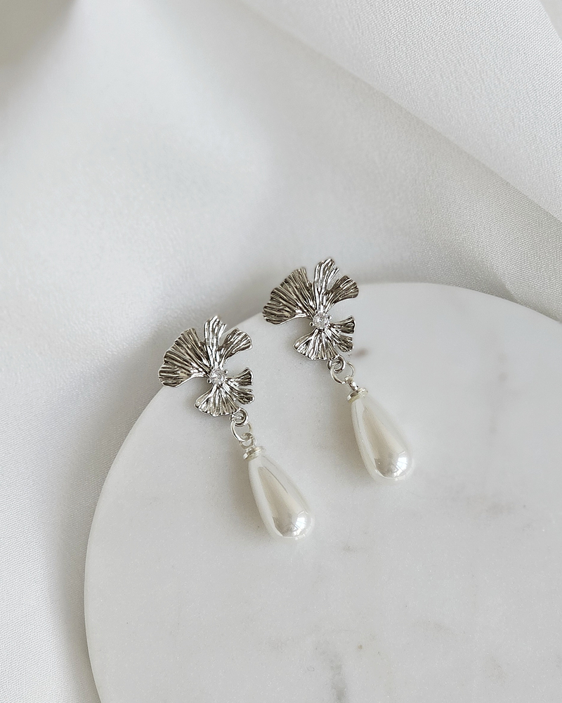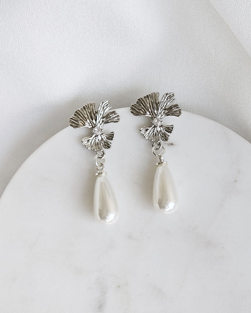 Aros plateados con hoja enchapada en rodio sin níquel y circonita al centro, con perla de fantasía alargada.