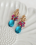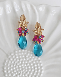 Aros de hoja dorada con cristal calipso y racimo de cristales fucsia y calipso