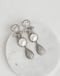 Aros plateados con base de cuarzo rodeado de circonita, enchapado en oro blanco sin níquel, hoja plateada, perla rodeada de circonita y gota de micropavé.