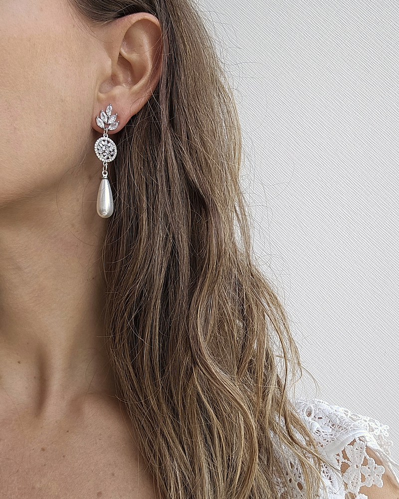 Aros plateados de fantasía, con base y centro de circonitas, con perla alargada de fantasía al final.