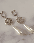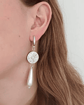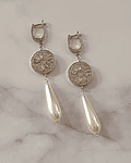 Aros largos plateados tipo argolla con circonita, conector de cristales y circonita, y perla de fantasía larga