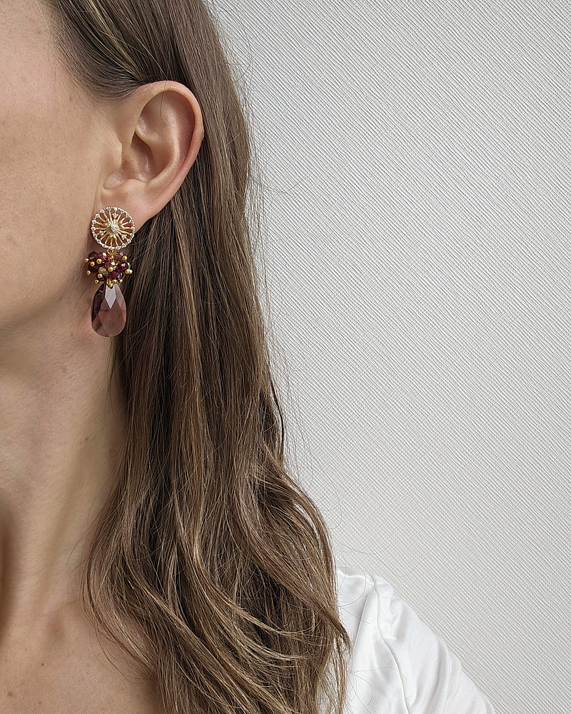 Aros dorados, mandala con circonita, cristal burdeo transparente y racimo en tonos burdeos, rojo oscuro, champaña y dorado
