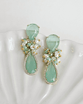 Aros color verde menta enchapado en oro, con gota menta rodeado de circonitas con racimo de cristales y perlas de fantasía.