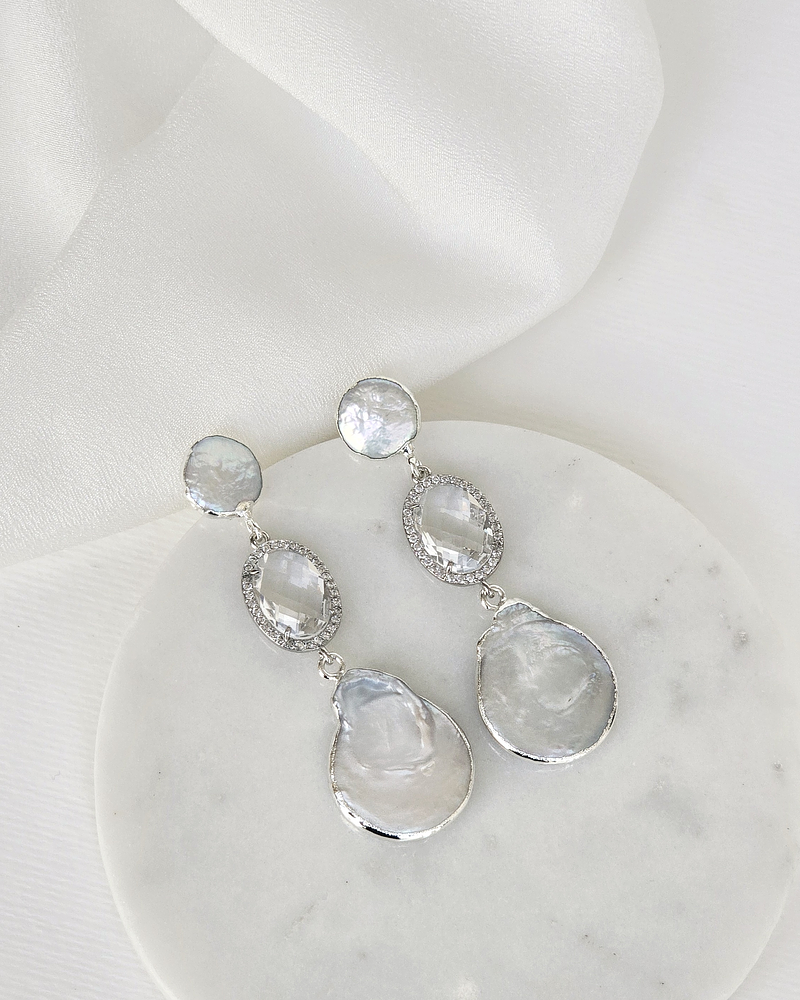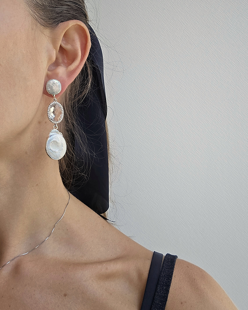 Aros plateados de perla enchapado en oro blanco, cristal transparente rodeado de circonitas y perla plana. Todas las perlas son naturales.