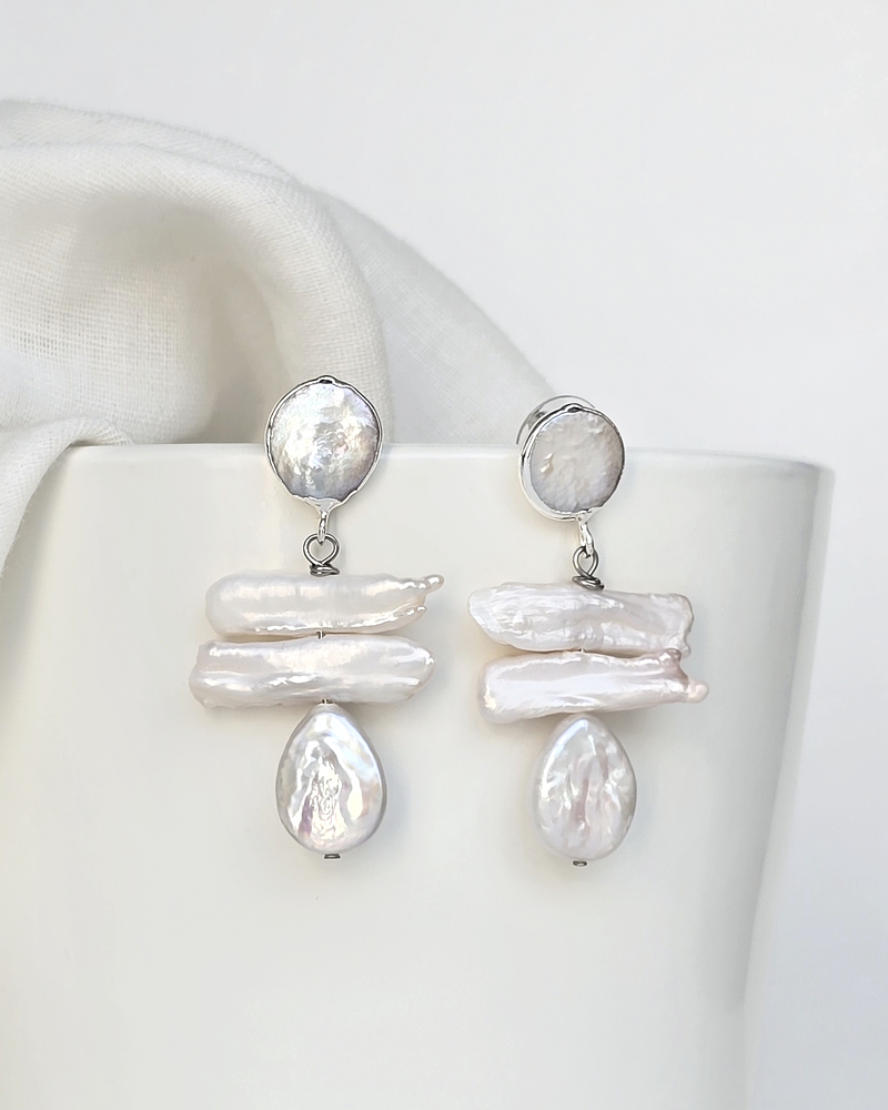 Aros plateados de perla enchapados en oro blanco, con distintas perlas naturales irregulares.
