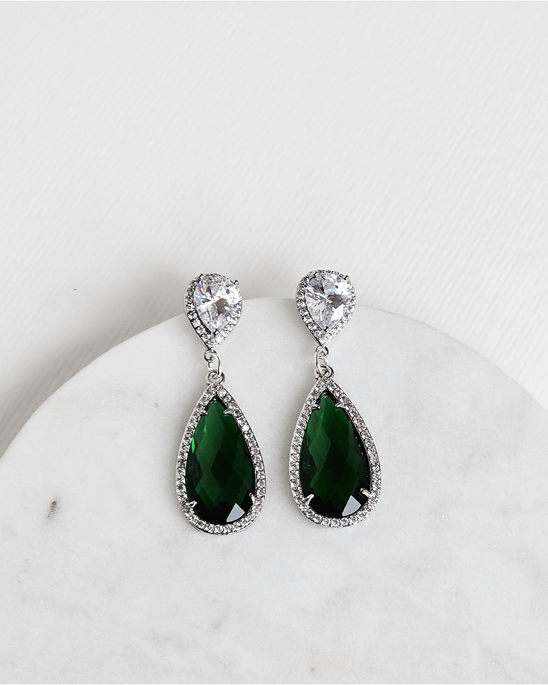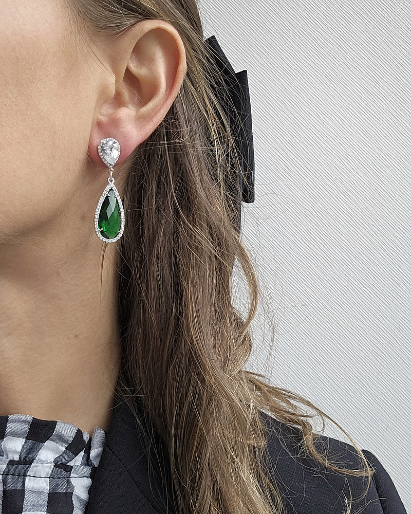 Aros plateados con base de circonita enchapado en rodio sin níquel y cristal verde rodeado de circonita.