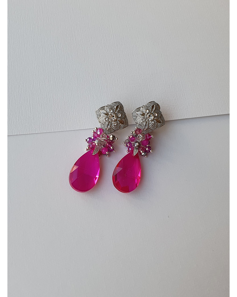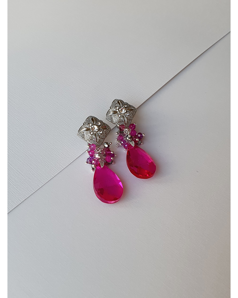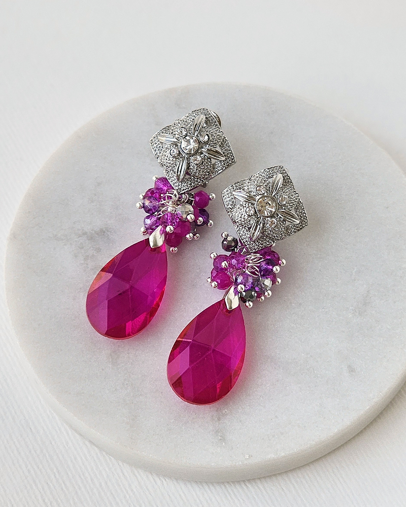 Aros plateados con circonitas, cristal fucsia y racimo de cristales en tonos fucsias, plateados y morados.