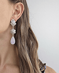 Aros plateados largos geométricos con centro de flor con circonita y cristal facetado rosa rodeado de circonitas.