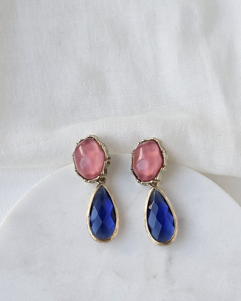 Aros dorados de fantasía de base de resina rosado con cristal alargado azul.