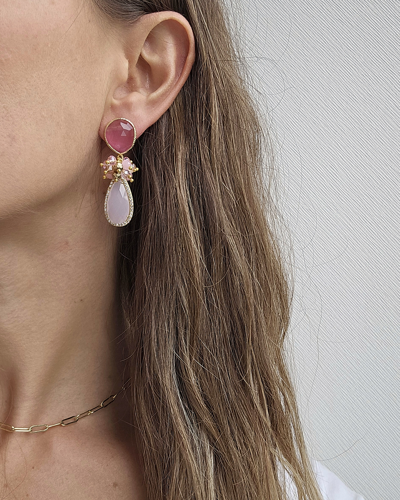 Aros dorados con ojo de gato rosa enchapada en oro y cristal rosado rodeado de circonitas con racimo de cristales.