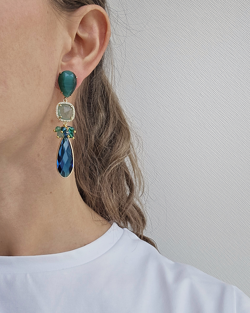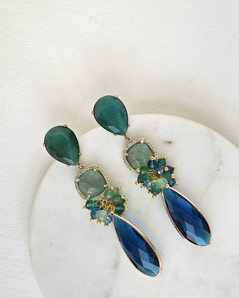 Aros dorados con base de piedra ojo de gato verde enchapado en oro, piedra verde rodeada de circonitas y cristal alargado petróleo con racimo.