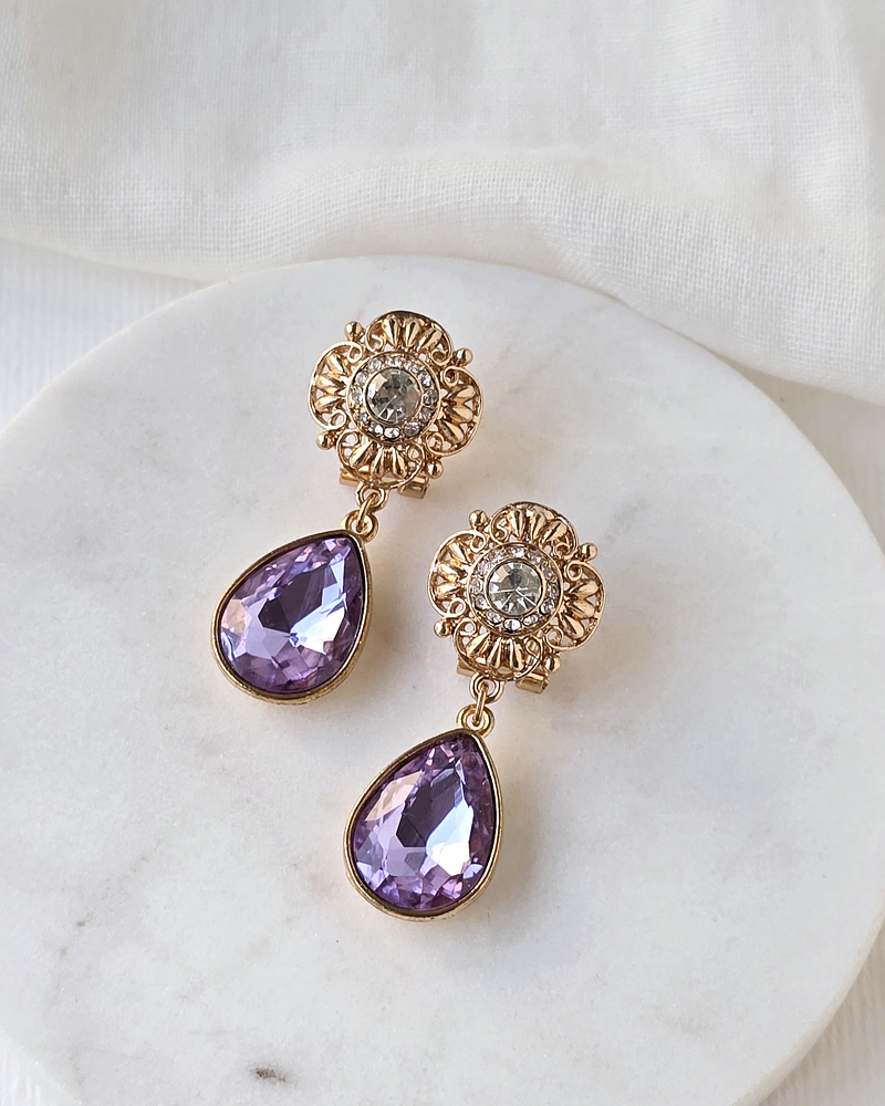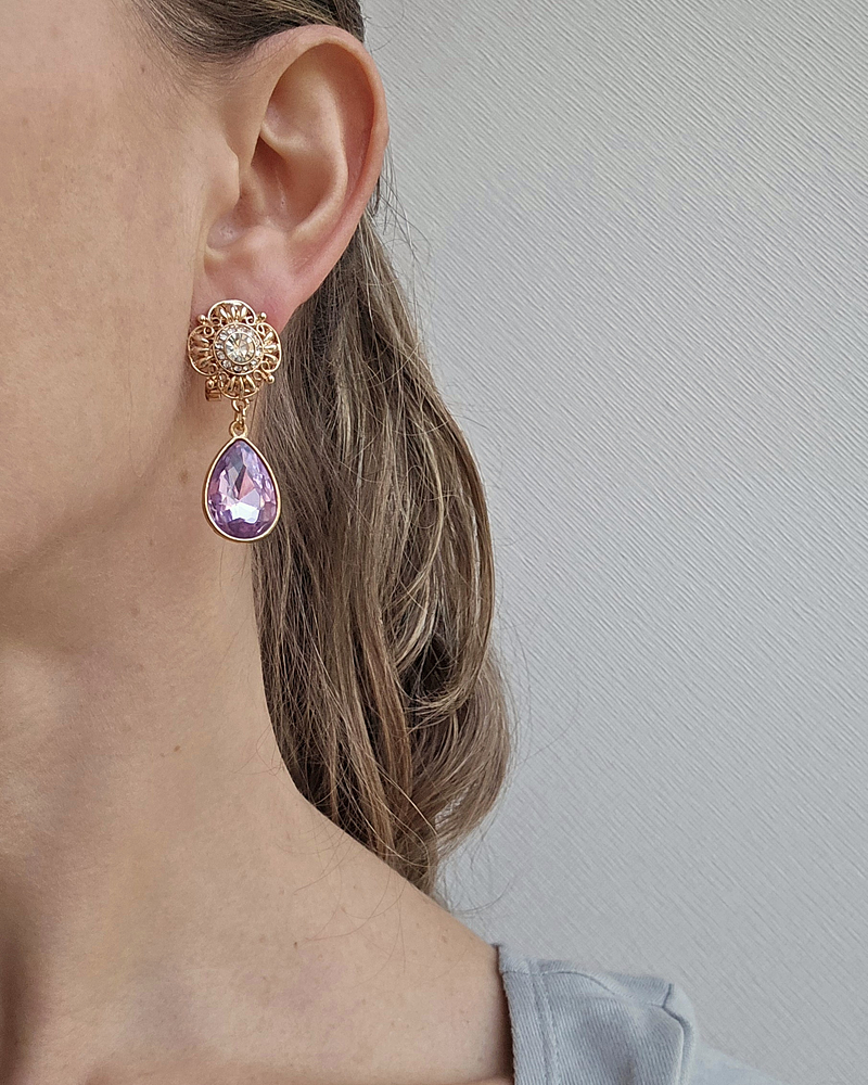 Aros dorados de base vintage con circonita, de fantasía con cristal lila brillante.
