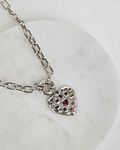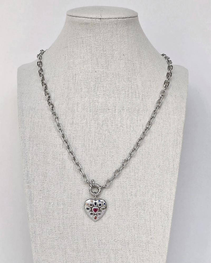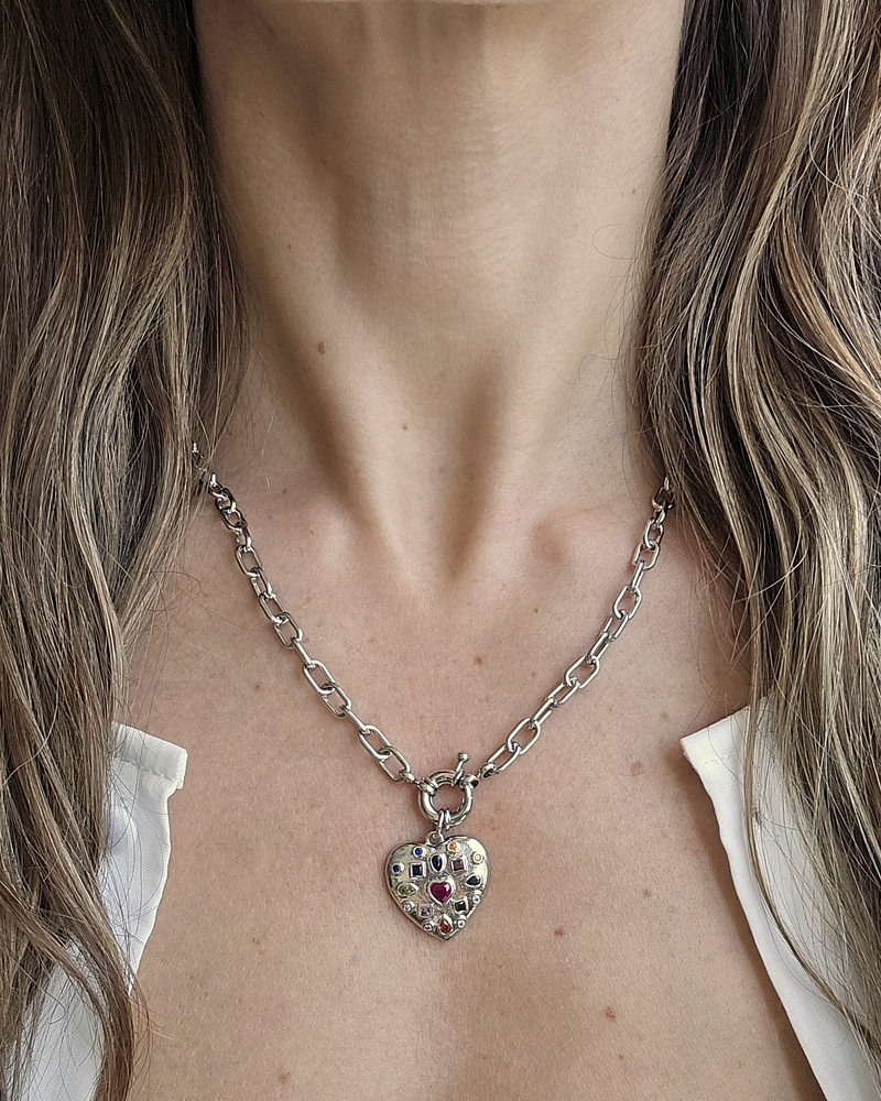 Collar plateado enchapado en rodio, libre de níquel, con broche de timón y corazón con circonitas y cristales de colores.
