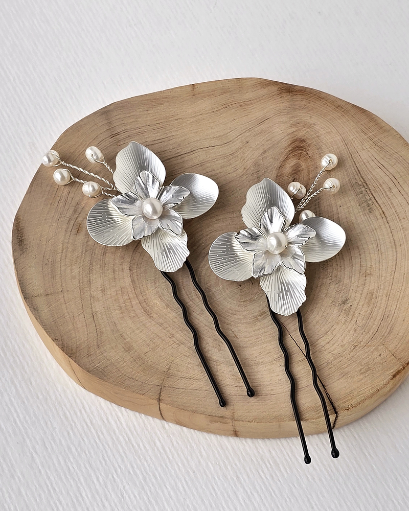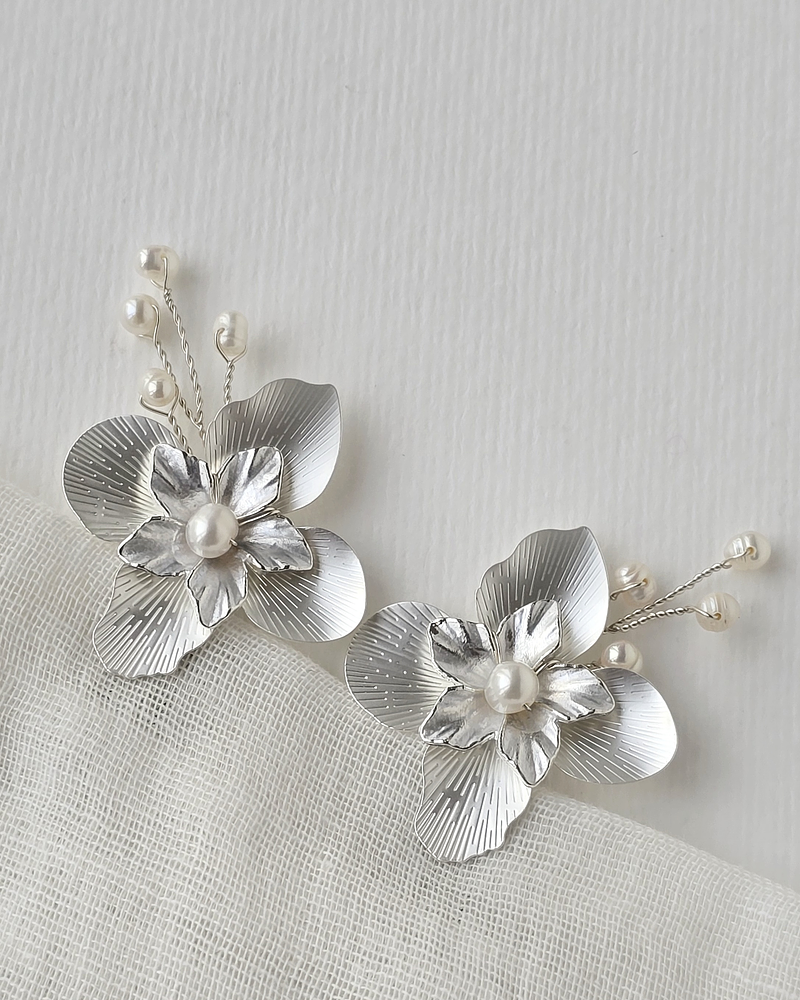 Set de 2 pines de flor plateada, con perla natural al centro y ramito de perlas naturales.